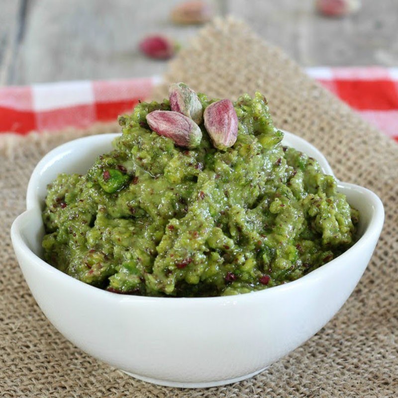 Ingredienti: pistacchi di Bronte sgusciati, pecorino, parmigiano, basilico, olio extravergine d'oliva.